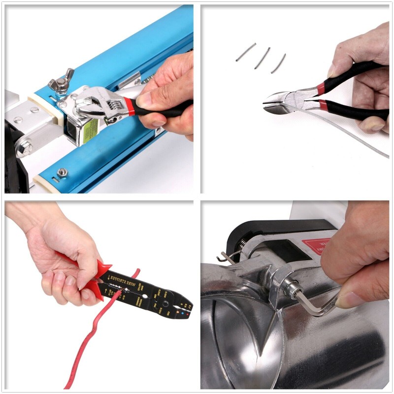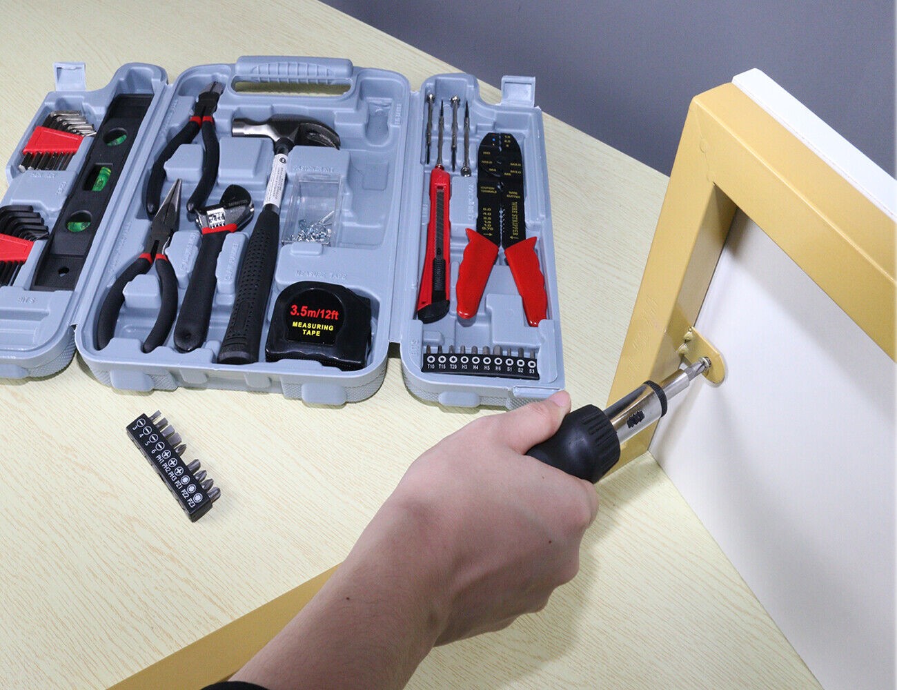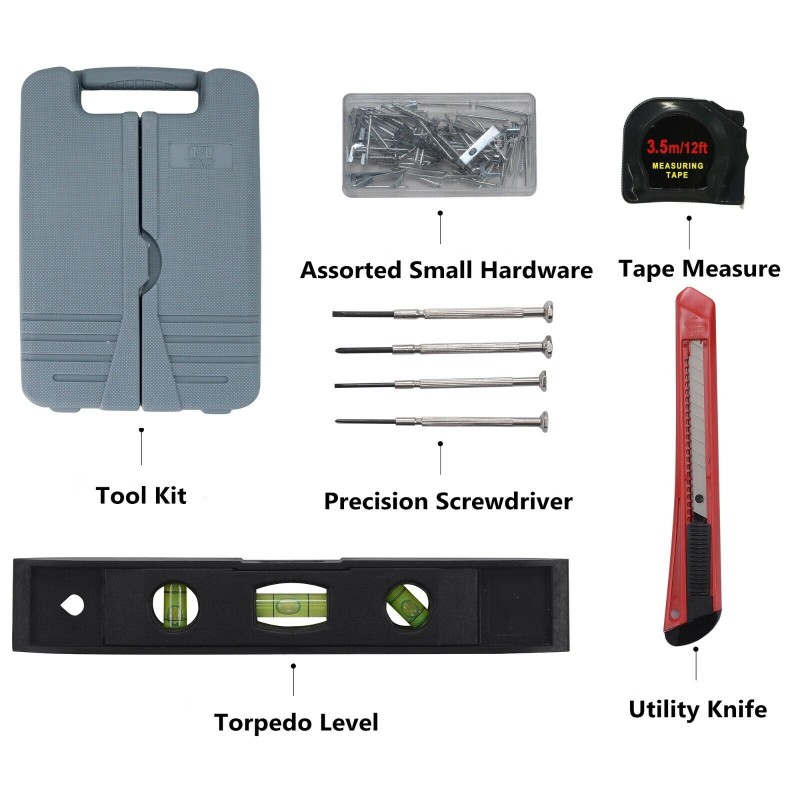 Clamp, Hammer, Hex Key, Knife, Level, Pliers, Screwdriver, Tape measure, Wrench, Tool box, Wire stripper, Snap-off knife, Fastener kit