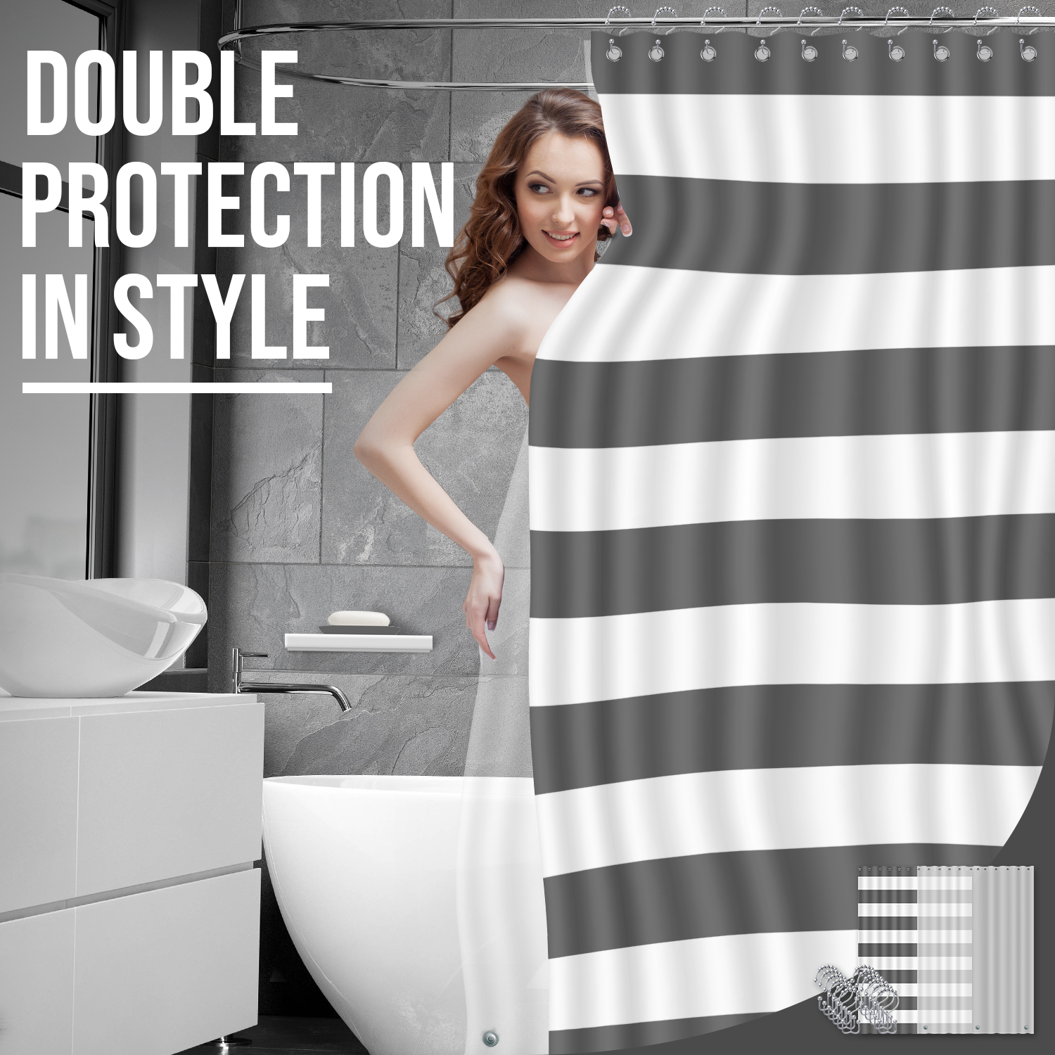 Shower Curtain, Shower Curtain Liner, Bin, Shower Curtain Hooks, Soap Dish, Soap Dispenser, Toilet Brush & Holder Set, Toothbrush Holder, Tumbler