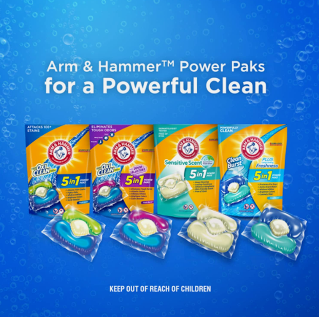 ARM & HAMMER™ Plus OxiClean™ with Odor Blasters 5-in-1 Power Paks offer 5 powerful cleaning benefits in 1: odor elimination, deep cleaning, whitening whites, brightening colors, with a powerful fresh scent booster. Odor Blasters is specially formulated to eliminate tough odors like body odor, sweat and musty towels by attacking them at their core, leaving clothes clean and smelling great with a long-lasting Fresh Burst scent. Get effective cleaning power with ARM & HAMMER™ Plus OxiClean™ with Odor Blasters 5-in-1 Power Paks. Our powerful formula is designed to work in cold and hot water as well as all machines including high efficiency (HE). Drop one in today! Tough times call for value you can trust. When you’re feeling the price pinch, Give It the Hammer.