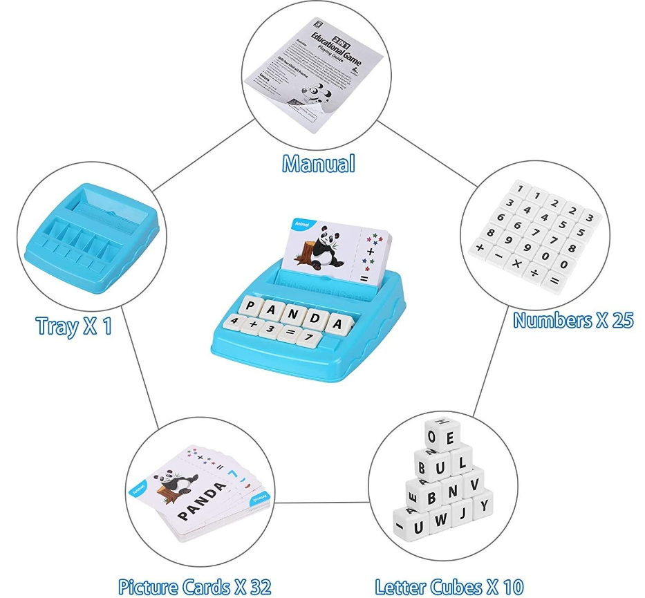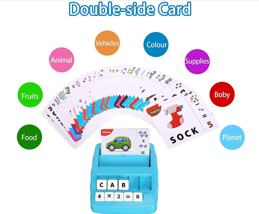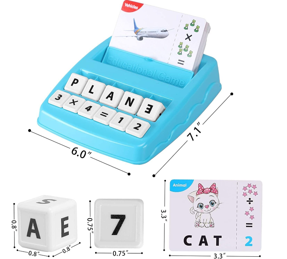 • 1.2-in-1 Spelling & Counting Educational Toys - Each card shows a picture of an object which kids are familiar with and arithmetic operation. Put the card in the card holder, kids need to find the right letters/numbers and put the letter/number cubes on the letter/number holders to complete the matching letter game.