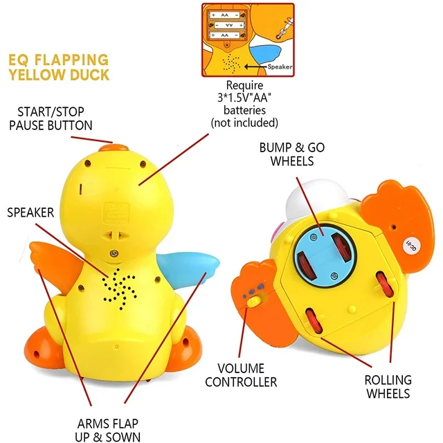 Make playtime and learning fun with HANMUN Walking Musical Dancing Yellow Duck. The little ducky will scoot around the home non-stop, providing endless entertainment for your young one. Features: Bump and Go Action, Wings flap and light up when the music begins, Lights, Music, and Talks (Adjustable Volume), Buttons on duck imitate duck sound and sing a tune Anytime the duck bags into something it just backs up and goes another way instead of just being stuck. It works a little smoother and quicker on the floor but works fine on the carpet.