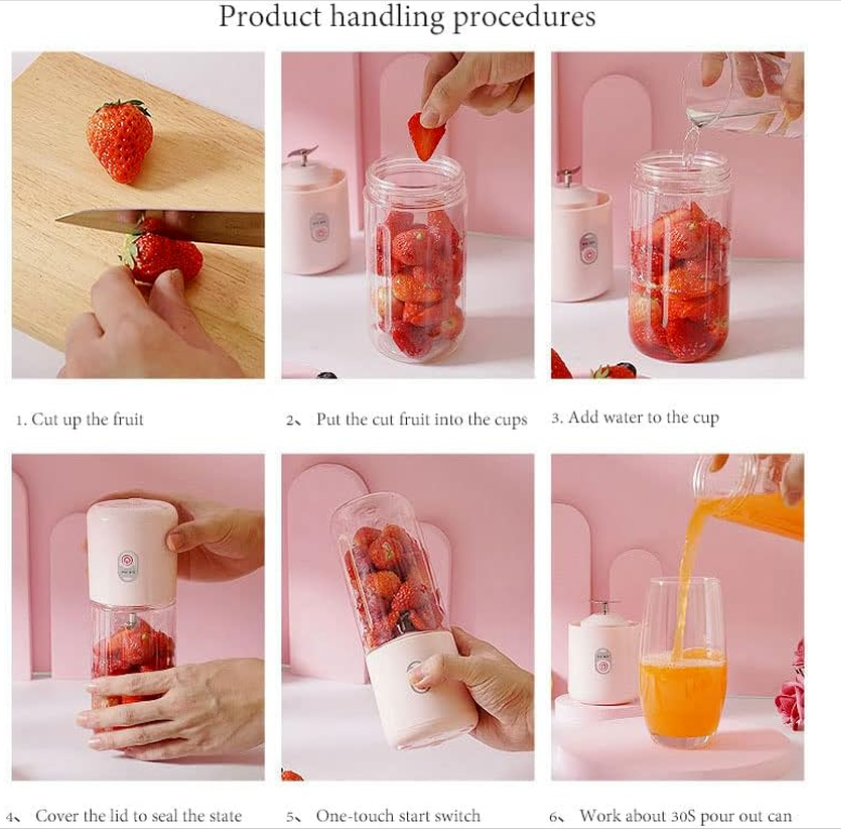 Instructions for use: clean the auxiliary ingredients into the cup, add the appropriate amount of water, tighten the juice machine, start the switch to start working (built-in safety valve, no tighten the cup to start, the product will not work). Single use try not to exceed one minute, you can pause and then start. If the new machine does not work, is no power, please charge first and then use.