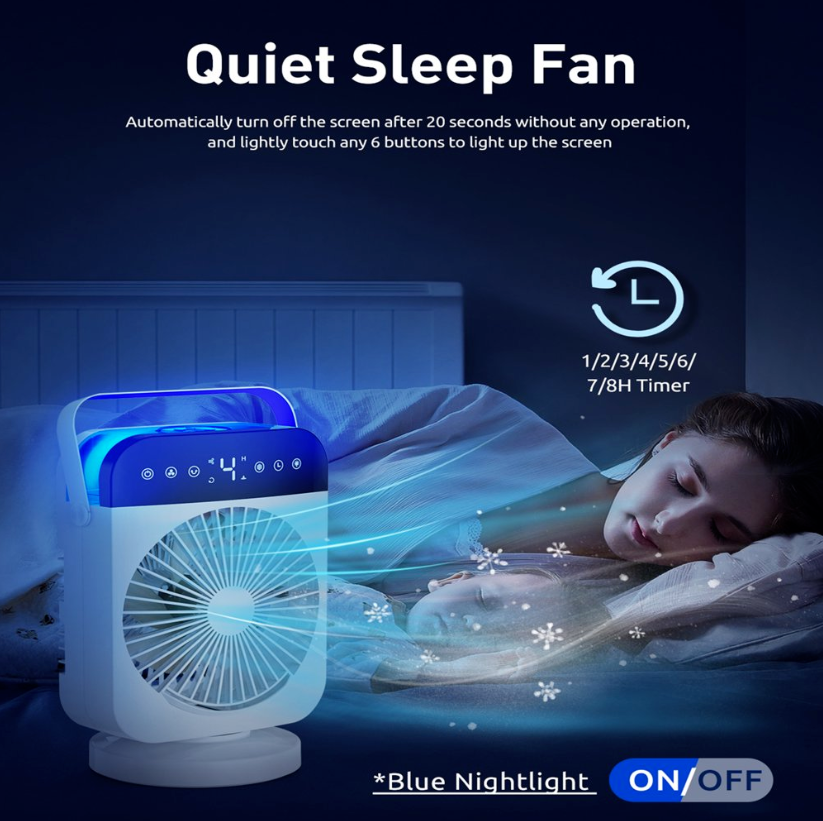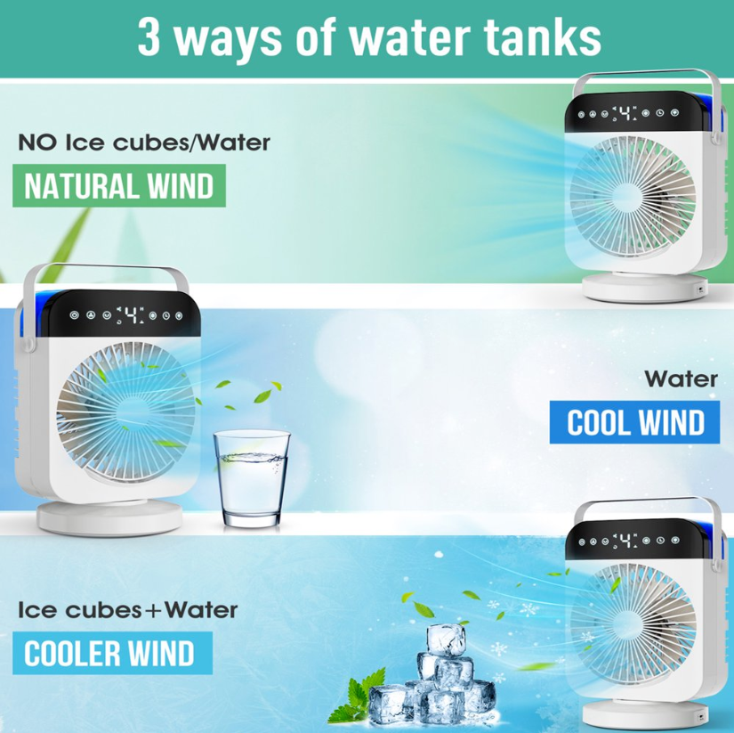 ❄Mini portable air conditioner can save your money and blows cooling wind, keeps your skin moisture and enjoy fresh air, which is very easy and portable to carry & move. It can be multifunctional as a combination of a mini air conditioner, desk fan, misting fan, night light, and humidifier.