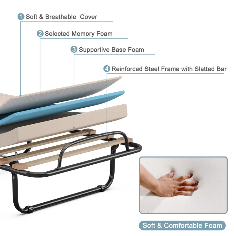 Portable Folding Bed with Memory Foam Mattress Rollaway Cot Made in Italy